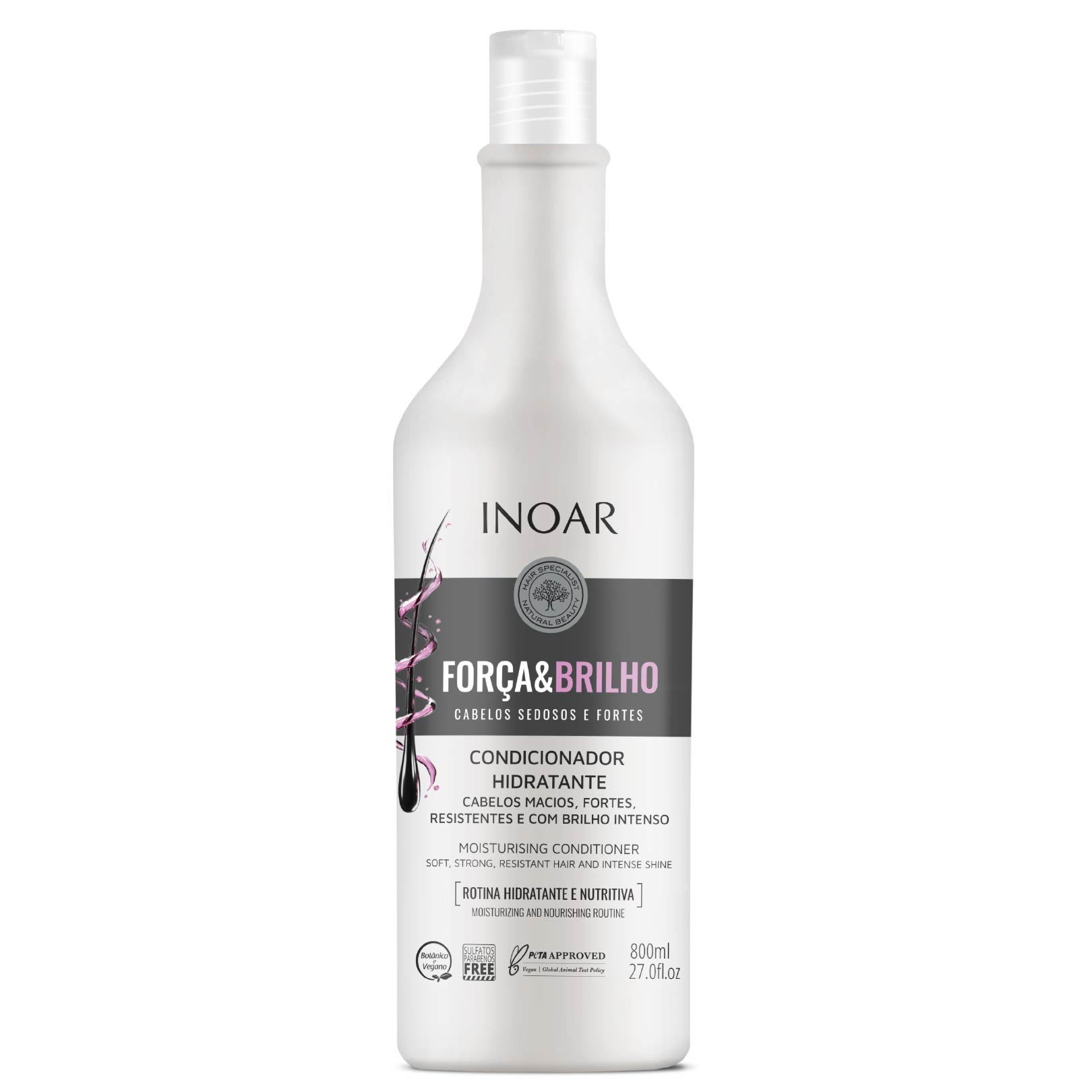 El kit Inoar Fuerza y Brillo presenta una poderosa fórmula vegana que revitaliza y fortalece el cabello, garantizando hebras más fuertes, brillantes y suaves al tacto, con una visible reducción del frizz, la opacidad, la aspereza y las puntas abiertas.